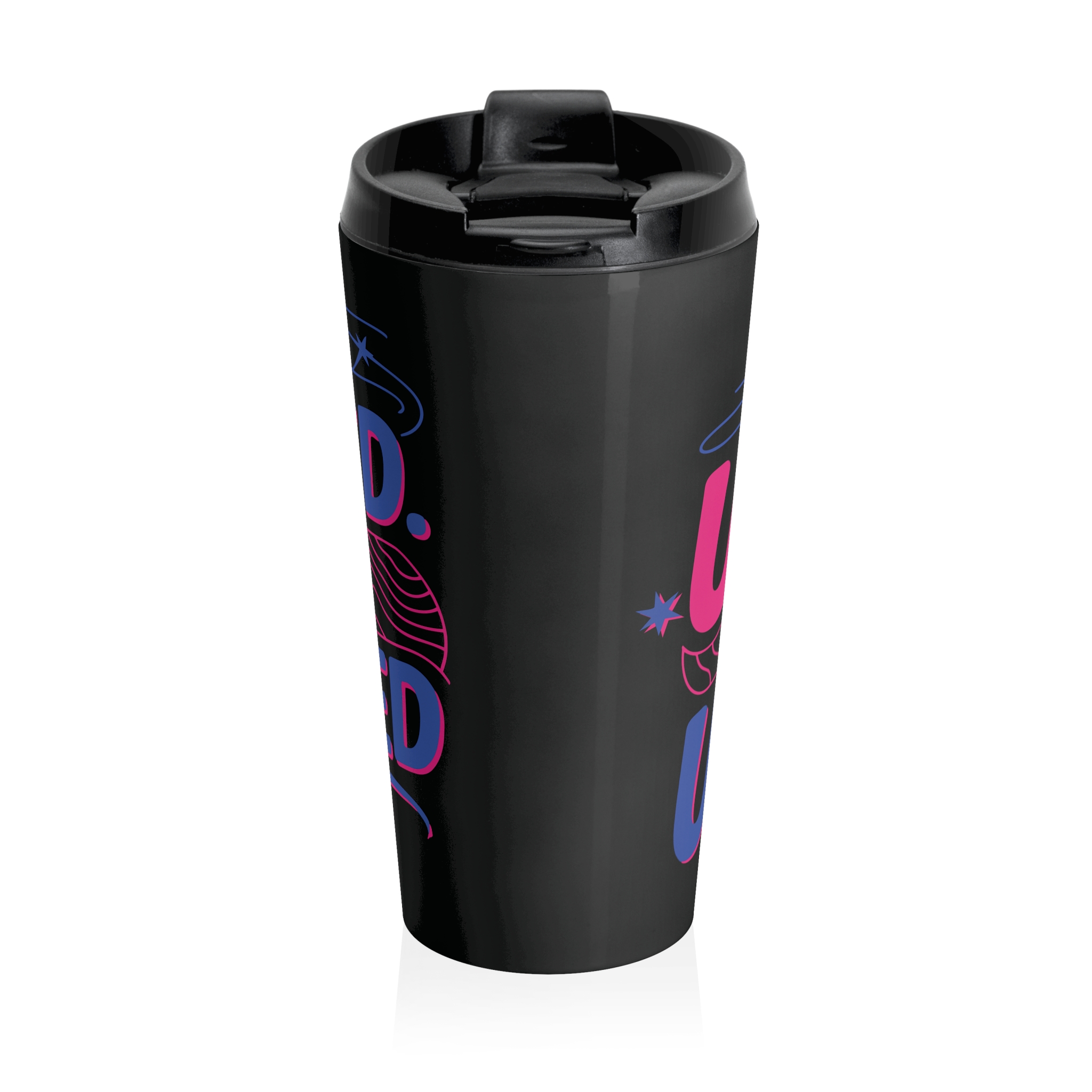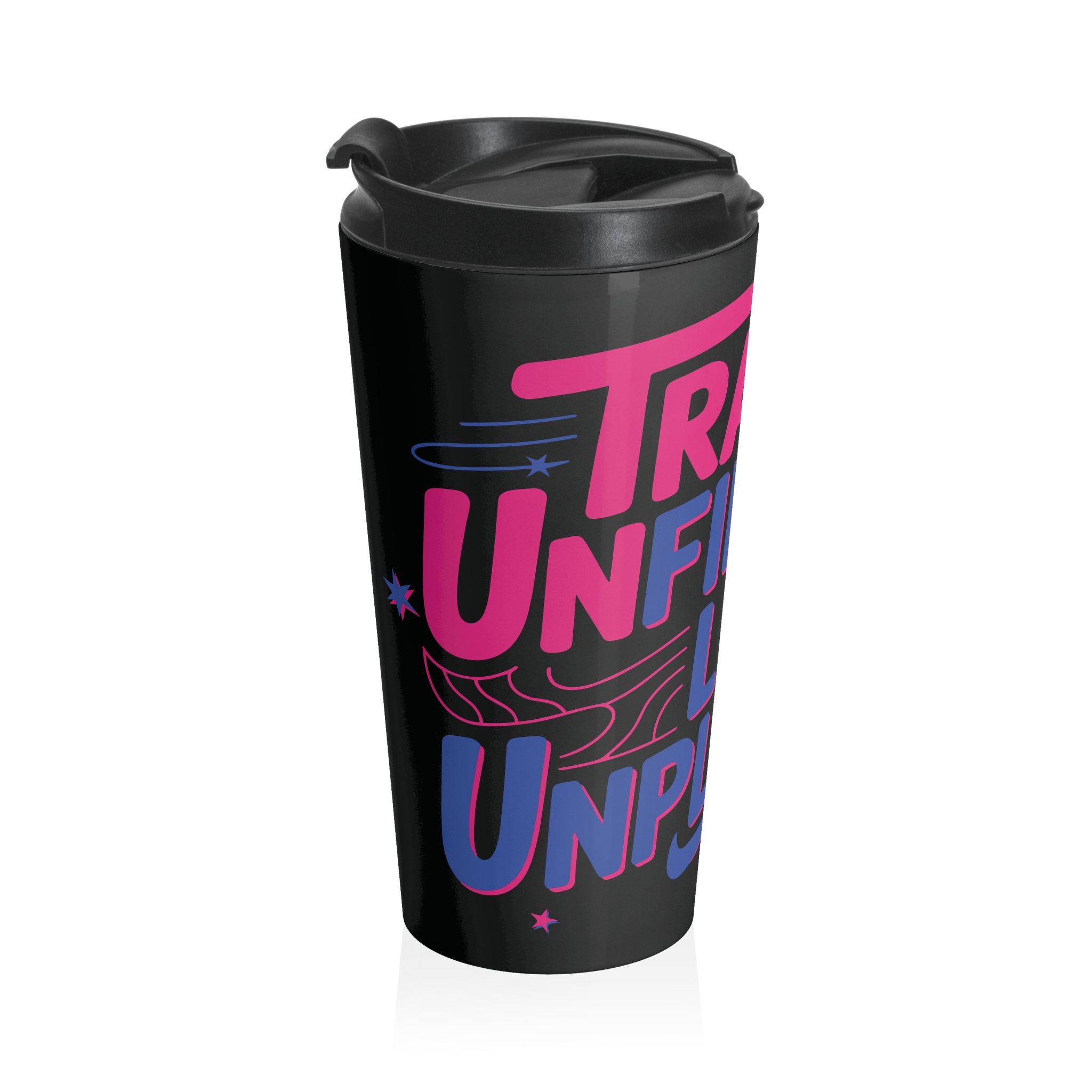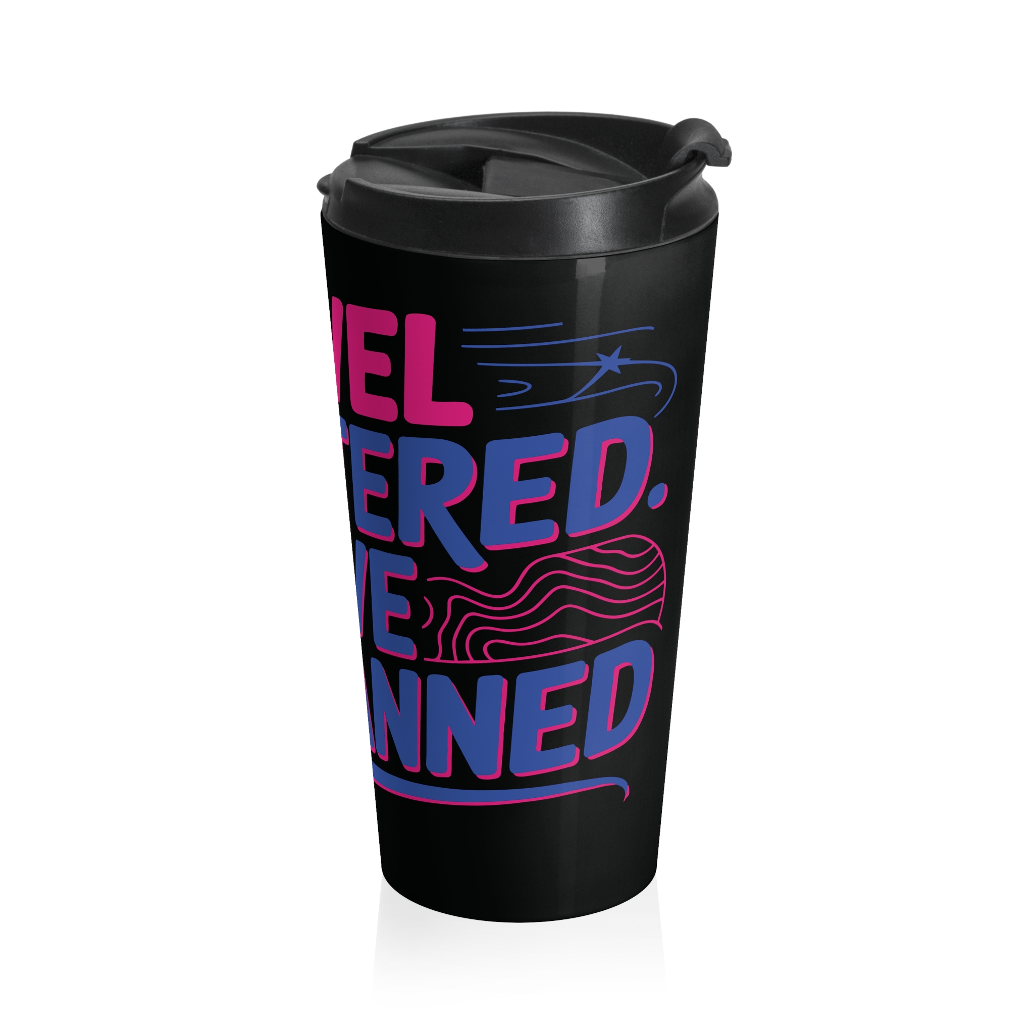 This 15oz stainless steel travel mug carries bold, colorful lettering and playful planet graphics on a deep black background — made for people who move through the world with curiosity. It feels solid and reassuring in hand: vacuum-insulated walls that keep drinks at the right temperature, a screw-on BPA-free lid with a flip top that locks in place, and rounded edges that slide easily into cup holders. Sip slowly on a sunrise commute, tuck it into a daypack for a city wander, or bring it to a late-night planning session. The design reads like a small declaration — bright, energetic, and a little clever — so it sits comfortably alongside travel journals, maps, and an adventurous mindset.